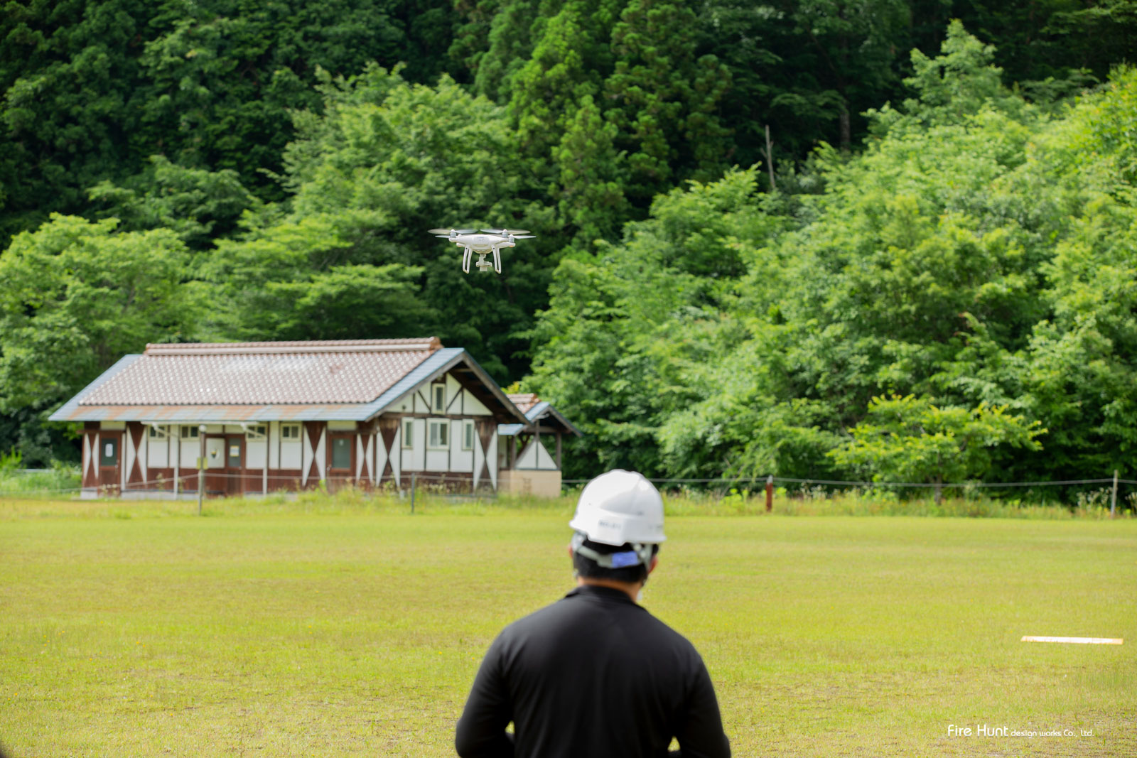 測量技師3名を、スタッフ総勢4名で対応いたしました。2日目の実技初日は雨が降り、狭い建物内での練習を行い午後から雨が止んだので、一通りの実技練習を行い、2日目は、杉の泊まりホビーフィールドに場所を移し、広い空で練習をしました。