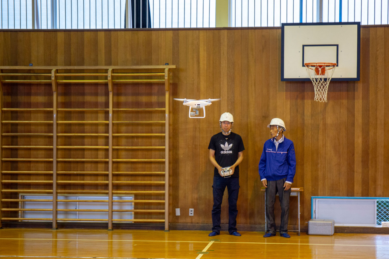 測量技師2名、映像クリエイター1名の3名を、スタッフ総勢5名で対応いたしました。狭い建物内での練習とGPS無しのATTIモードでのトレーニングをみっちり行い、皆さん、正確な飛行ができるようになりました。